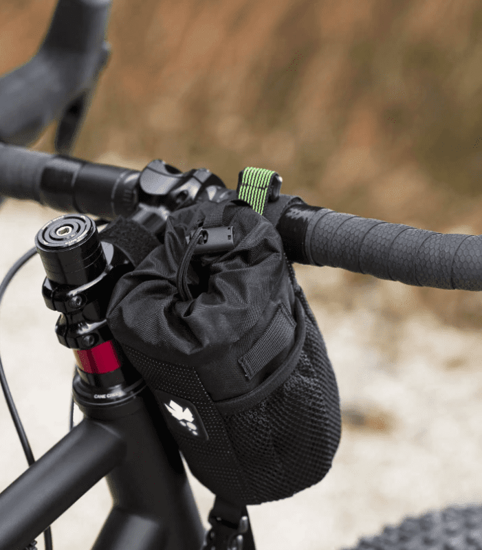 Bud bag is mounted between the handlebars and the stem via two Velcro  and then secured on the fork crown with a webbing.